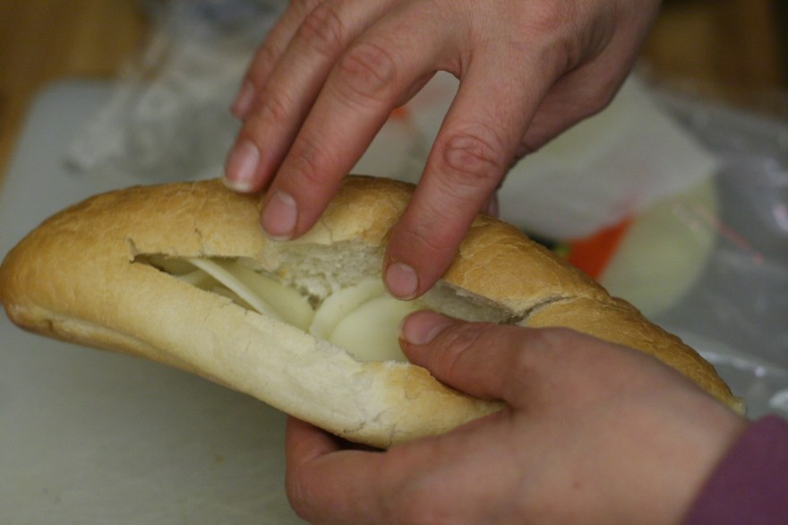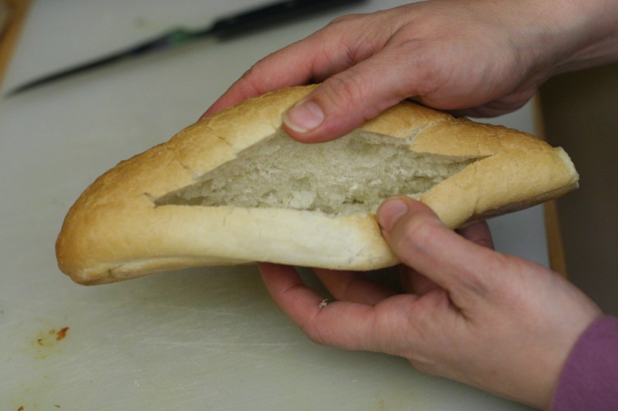 Take hoagie roll and make a slit on the side. Do NOT cut entirely through as you want there to be a pocket. Like this…