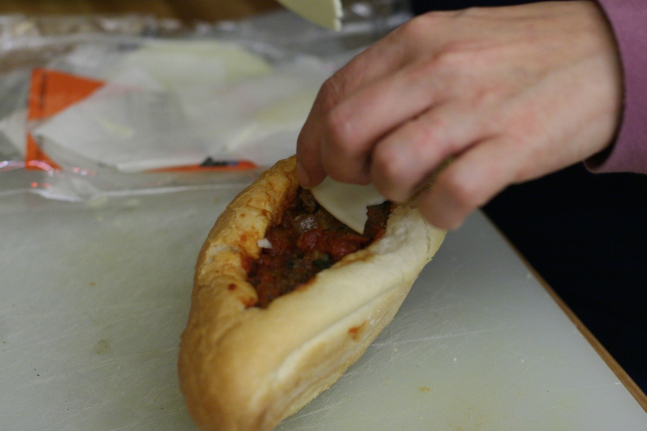 Add 3 meatballs and a little sauce (make sure the meatballs and sauce are hot ;you don’t want the hoagies to get soggy so watch the amount you add).