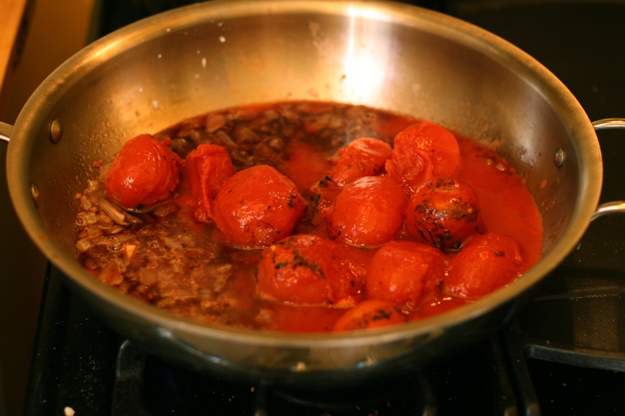 For the sauce, heat the olive oil in large pan. Add the onion and saute over medium heat until translucent, 5 to 10 minutes. Add the garlic and cook for 1 more minute.