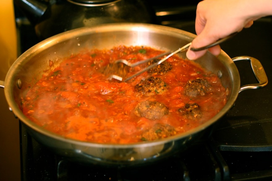 Once the meatballs are done, add them to the sauce, cover, and simmer on the lowest heat for 10 minutes.