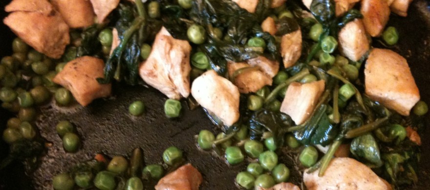 Let the spinach wilt/cook in the sauce, add salt and pepper to taste, and then I threw in some leftover sweet peas (I’m sure you can toss in some frozen ones if you have them)