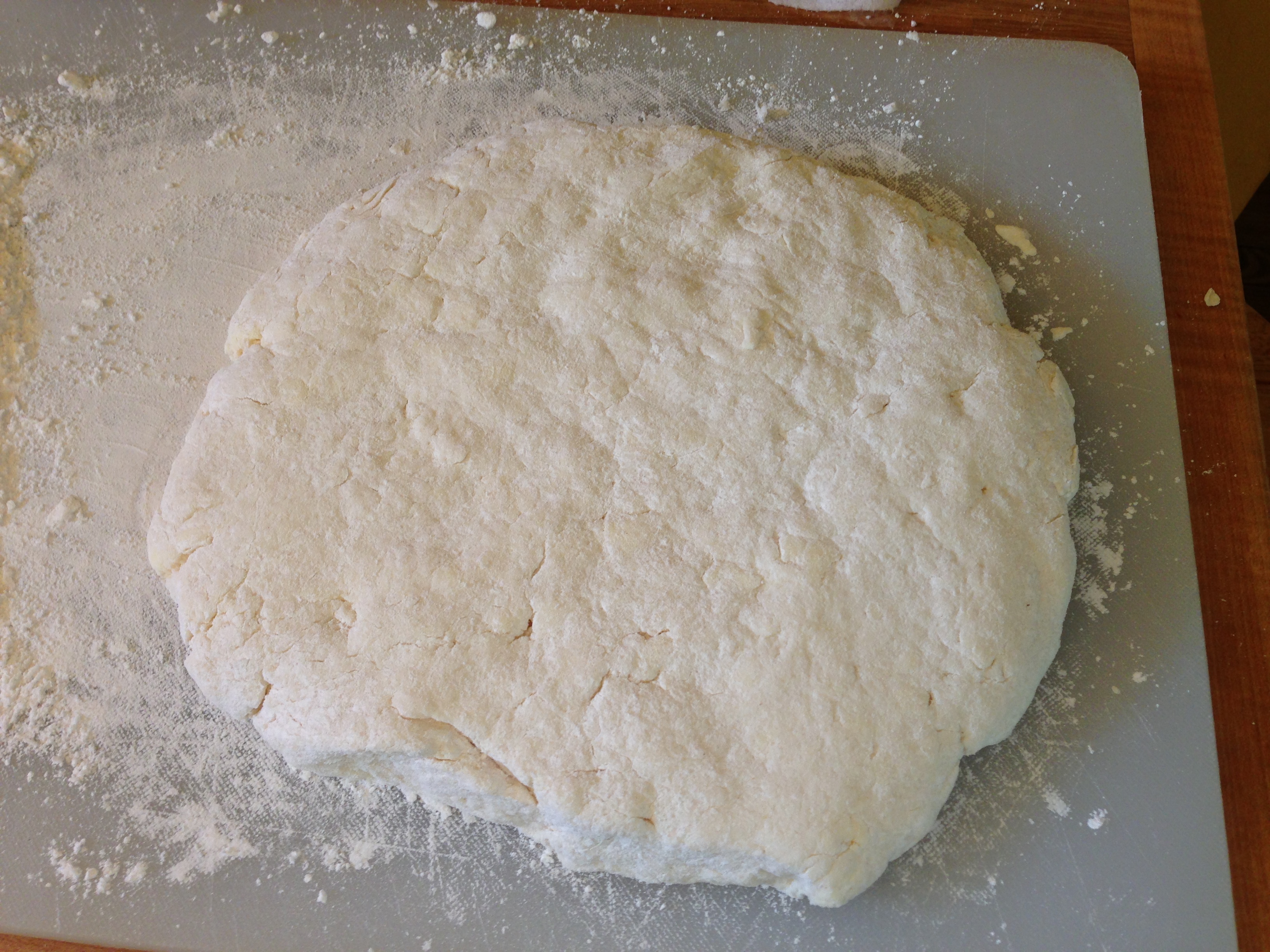 Turn it out on a surface dusted with flour. I never knead my dough. I pretty much pat it until it sticks together.