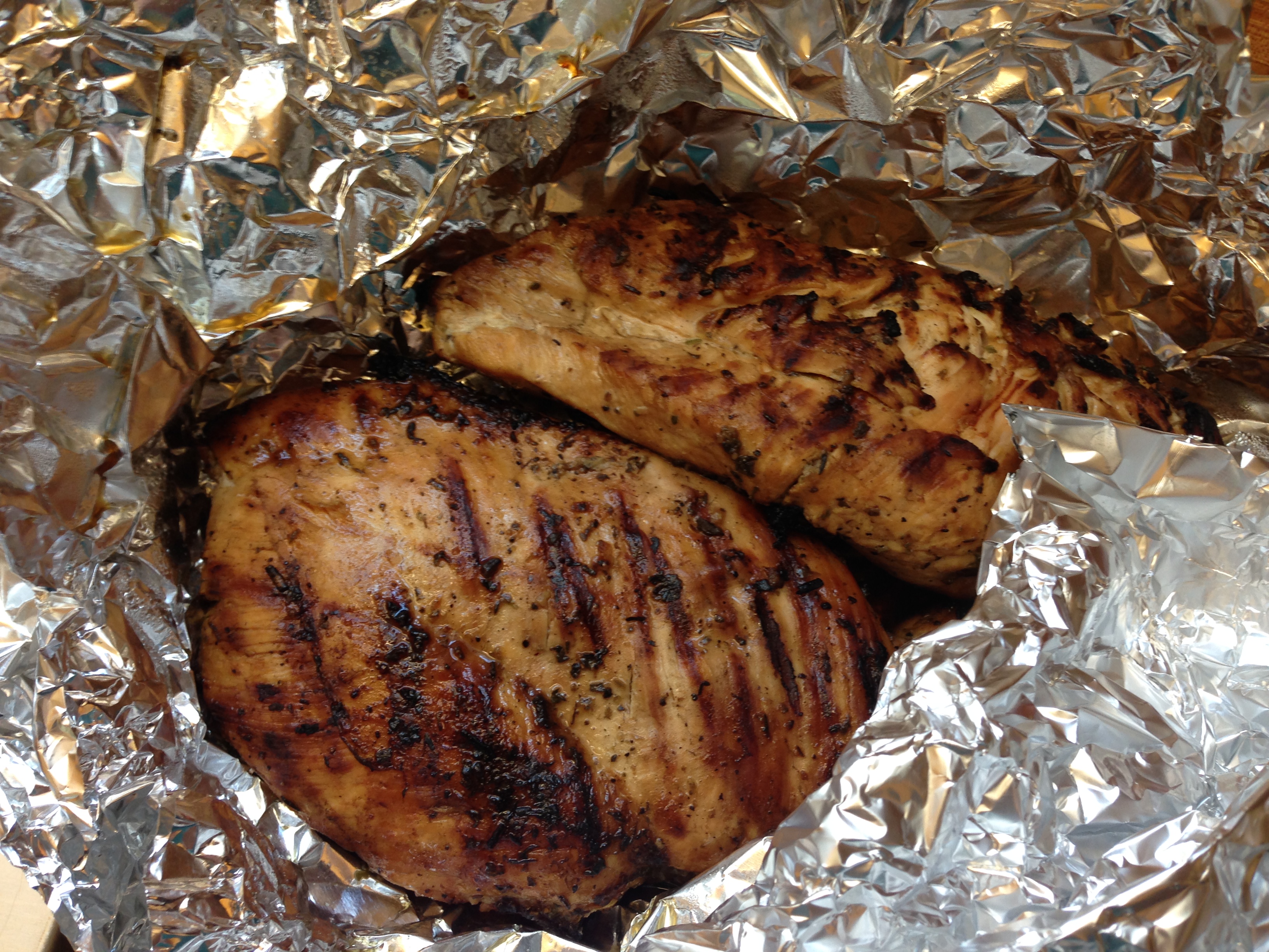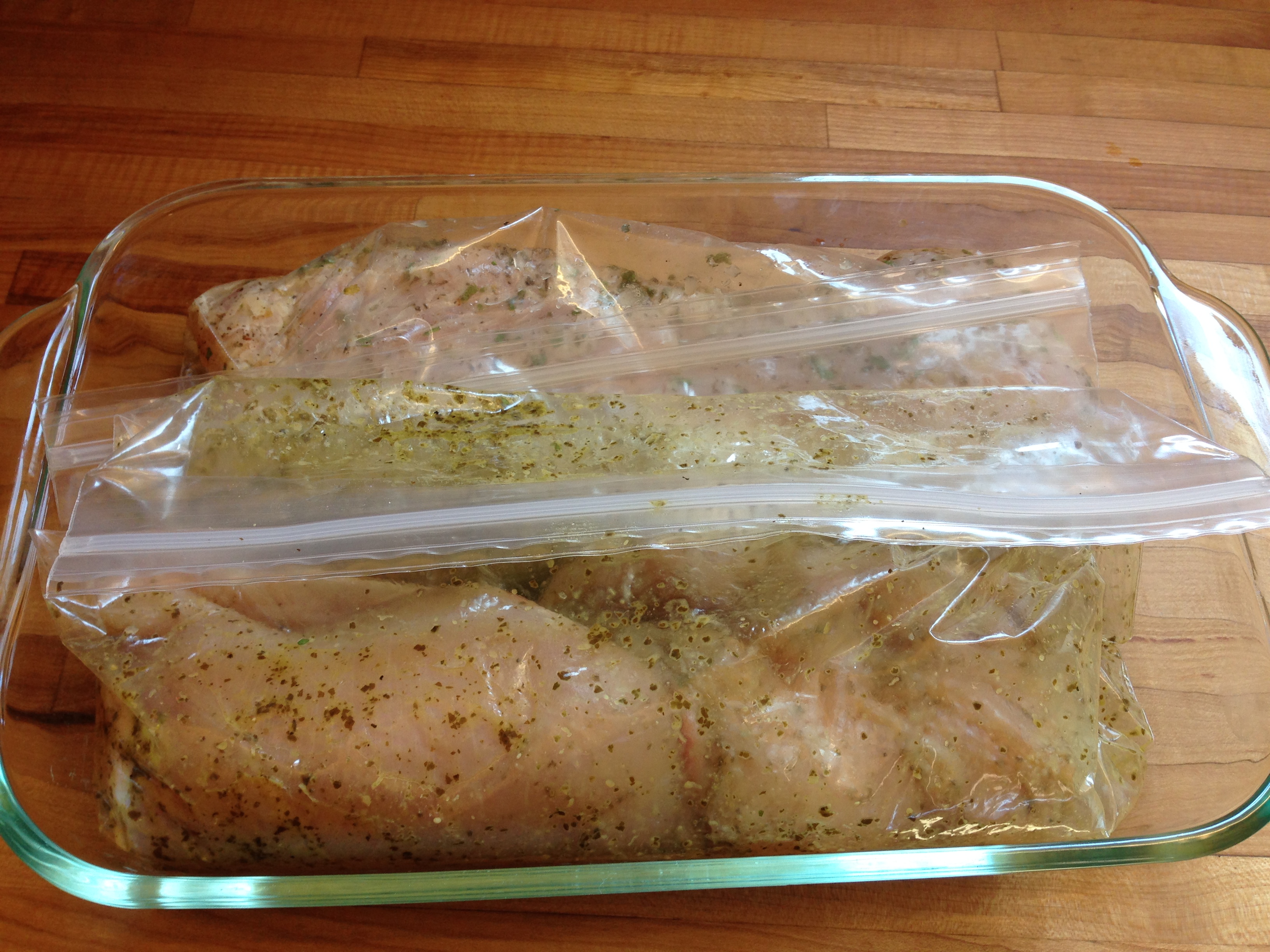 Grilled Pesto Chicken: Not sure how many points this has because all I did was pound two chicken breasts to uniform thickness and added to a storage bag with a tablespoon of pesto. Then I just squished all around until the chicken was covered and marinated in the fridge for a couple of hours. See?