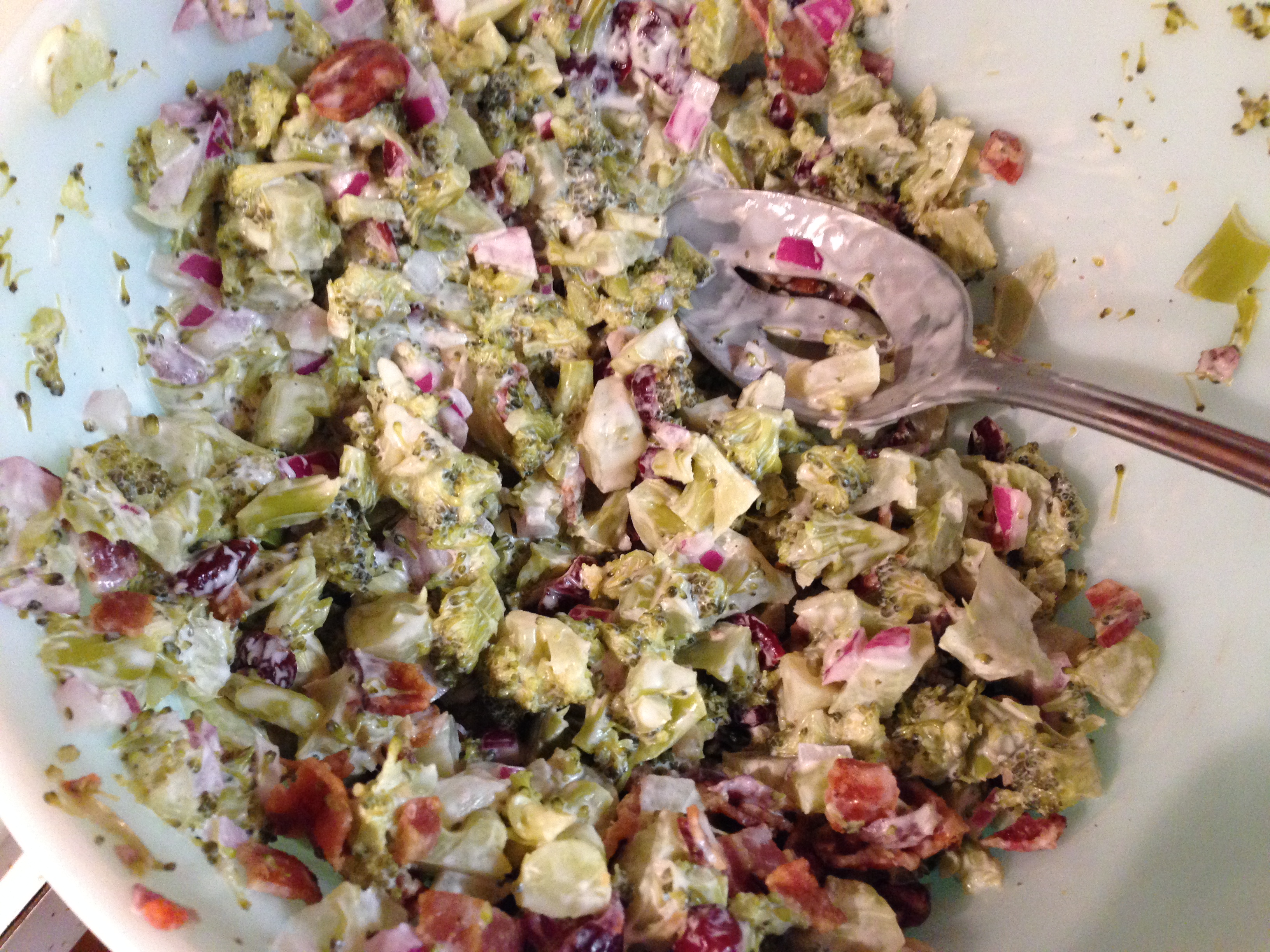 For the side, I decided to make Broccoli Salad. Pre-Weight Watchers I would have cooked an entire pound of bacon and used an entire cup of Hellmann’s Mayonnaise. Luckily, I found a lightened up BROCCOLI AND BACON SALAD recipe on LaaLoosh.com. Though I didn’t use turkey bacon and I added a few more cranberries, I think this turned out good. Each 1 cup serving equals 2 points. Since I broke some of the rules, I decided to double my points.
