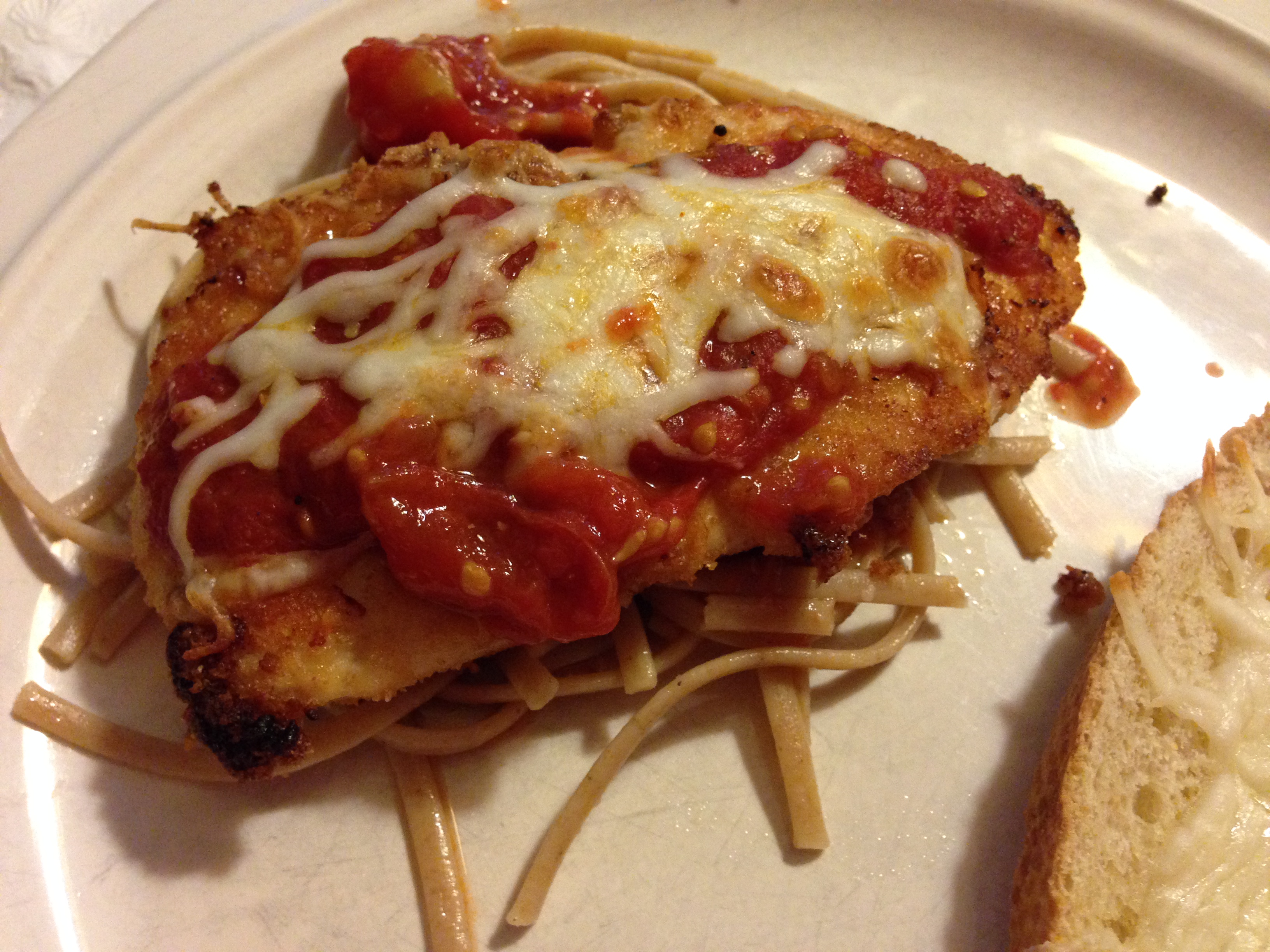 Next up: Skinnytaste’s Baked Parmesan Chicken with Oven Roasted Tomatoes
