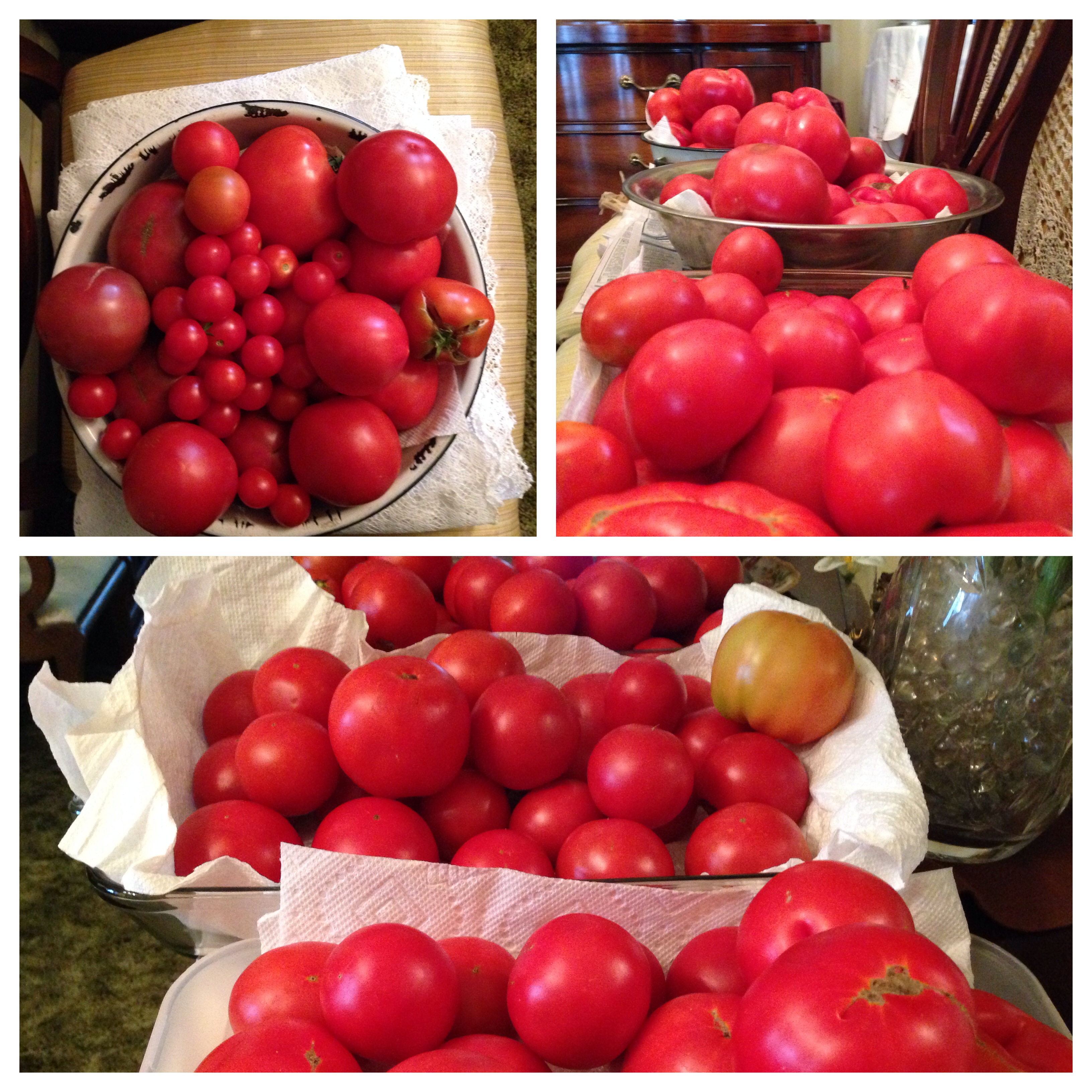 So there’s this thing that happens during an Alabama Summer. It’s called…Tomato Season. When they start coming in, they seriously start coming in. I normally reject tomatoes that are out of season. I just don’t see the point in eating some pink-fleshed, mealy, shipped-across-who-knows-where kind of tomatoes. I’d rather wait until Summer and just eat so many of them that I don’t even think about tomatoes any other time of the year. Needless to say, our tomatoes started to come in by the basket load last week, which immediately forced me to figure out what to DO with all of them.