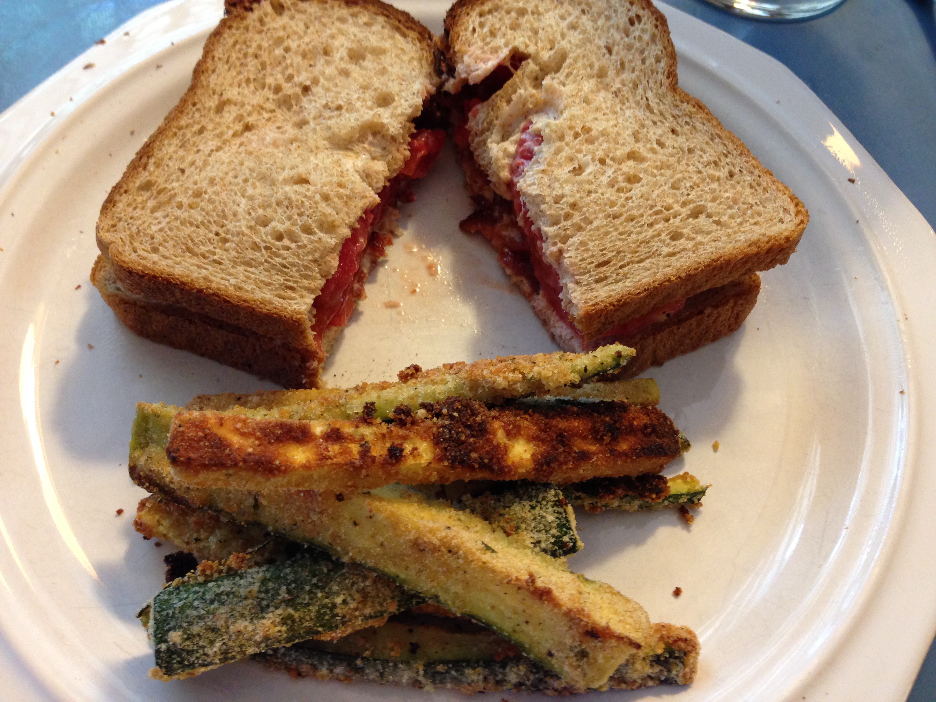 Next up: Let’s talk about the Baked Zucchini Sticks recipe I found on Skinnytaste. Now, I know what you are thinking and you are absolutely right. This recipe takes a little effort. Heck, anything that requires dipping in breadcrumbs is going to take some effort. That being said, if you go into it knowing there’s dipping involved and you just get zen with it from the beginning, I’m telling you it will be worth it. I doubled the recipe, which means it takes double the pans and double the process. Nonetheless, this was a big hit and I particularly liked it paired with my tomato sandwich. 1 zucchini cut into sticks = 3 Points. So with my low cal bread (2 total points), tomatoes (0), and a little mayo (1 pt), you are witnessing a 6 point dinner! Boom!
