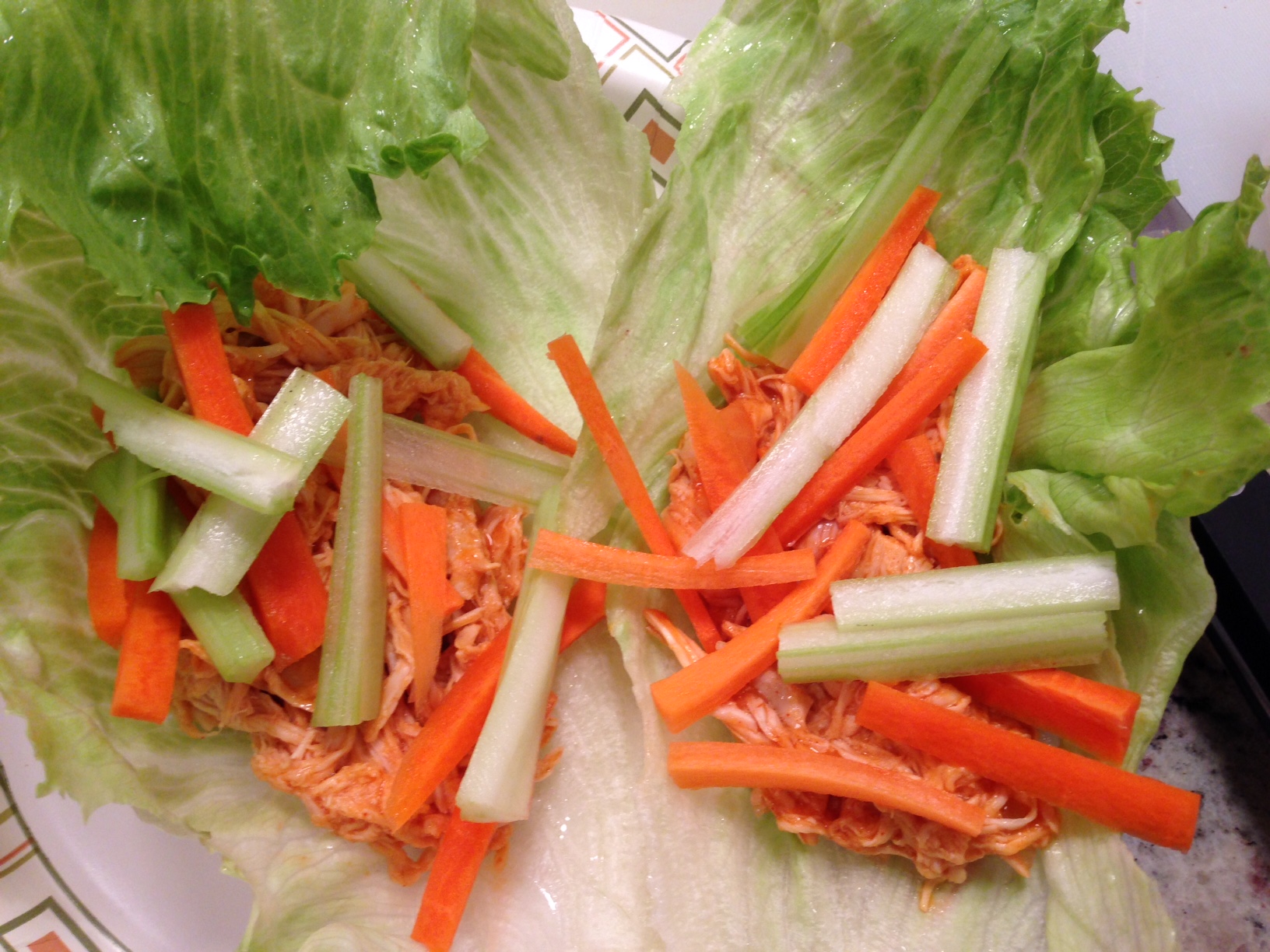 I like this recipe for a number of reasons: 1) Cooking the chicken in the Crock Pot actually works for many recipes (chicken salads, bbq, etc) and in my opinion it gives the chicken much more flavor than if you were to boil/microwave it. 2) It is super filling. 3) The hot wing sauce makes you think for a split second that you are eating wings when obviously you are not. 4) It has the perfect balance of flavors and crunch — hot wing sauce, cool, creamy ranch or blue cheese dressing, and the crunch from the lettuce leaf, carrots, and celery.
