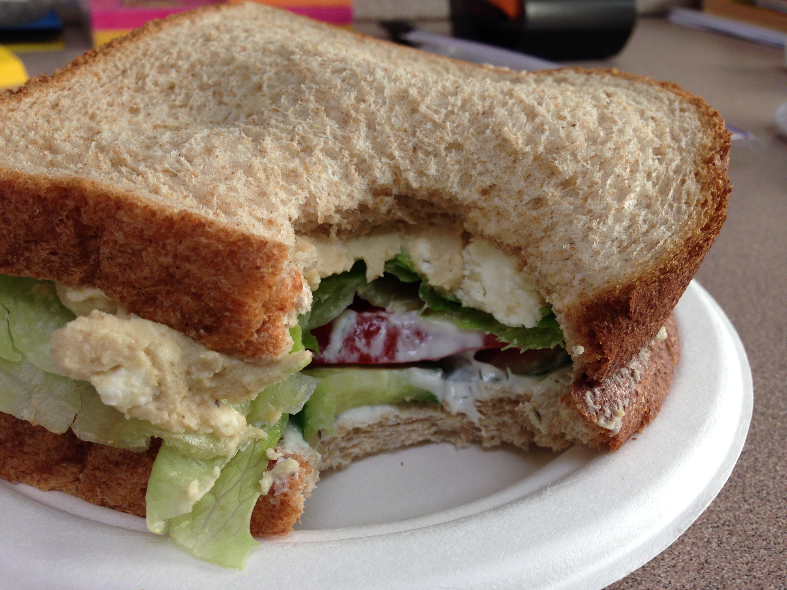 For lunch, I’ve been rocking a hummus sandwich. Low carb bread + hummus + loads of veggies + Tzatziki Sauce. I pair it with some carrots. I know, I know…I’m getting craaazzzzzzy over here. Carrots as a side? Yeah, I said it.