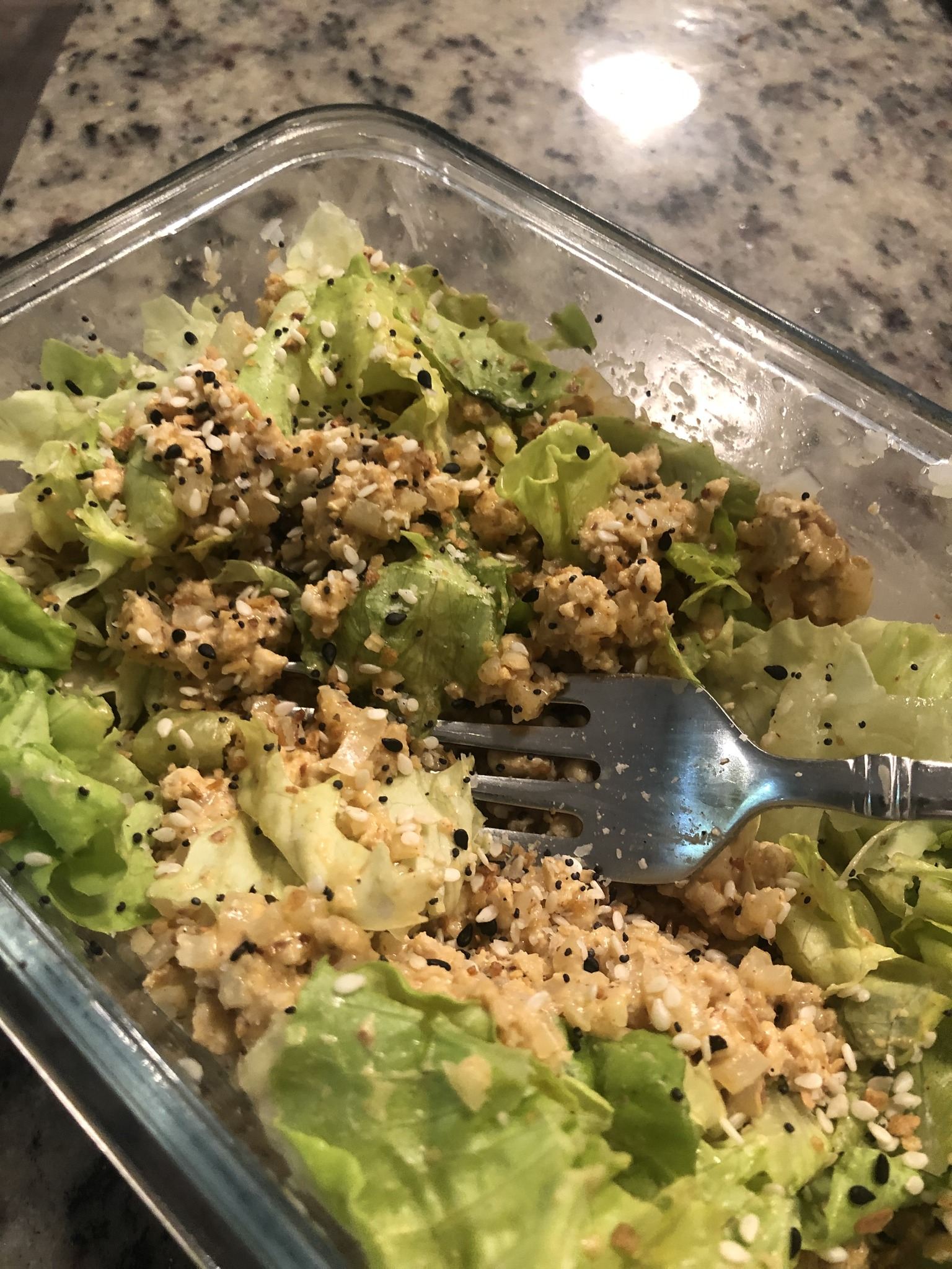 I have a food routine these days and it includes 5 fuelings and 1 Lean and Green meal. More on that later (maybe). One of the things that has stuck for me is being consistent, structured, committed, and being less afraid of a tried and true routine. My go-to dinner includes: 7 ounces of 99% fat free ground turkey breast with low sodium taco seasoning, 1 cup butter lettuce, 1 cup of cauliflower rice, Bitchin’ Sauce, and Everything But the Bagel seasoning.
