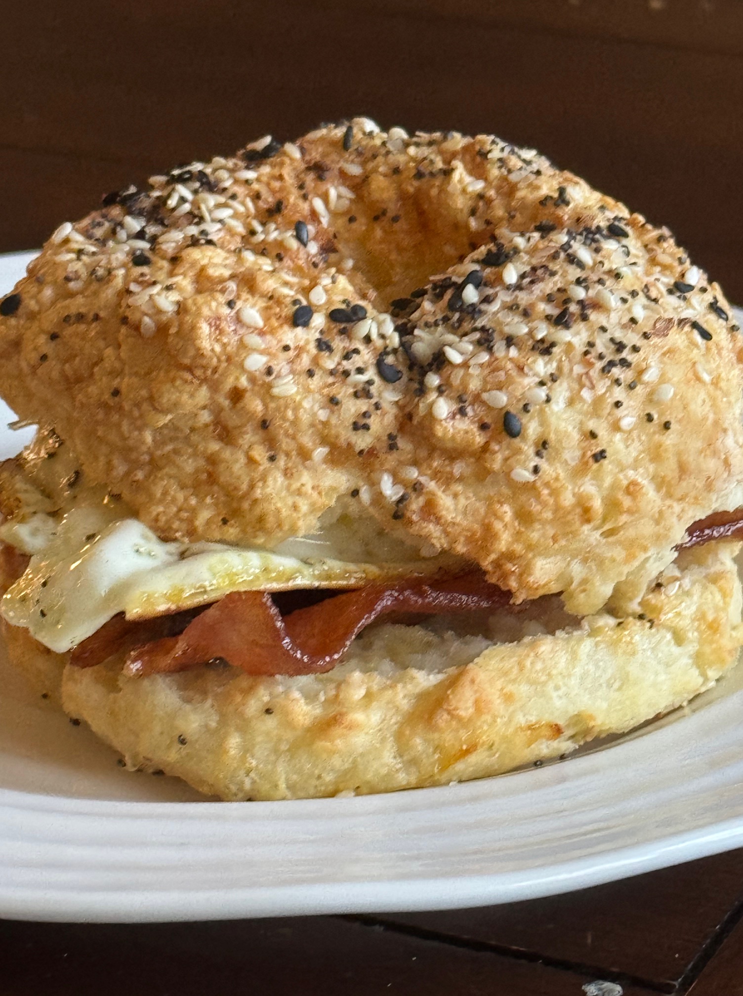 1 Skinnytaste Bagel, 2 Applewood Bacon Strips, 1 egg = 332 calories, 21g protein, 29g carbs, 15g fat