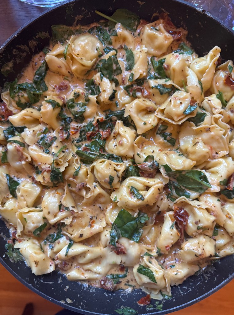 First up, Supper with Michelle’s Creamy Sun-Dried Tomato and Spinach Ravioli (I used Costco’s tortellini). This was so easy, but definitely not low-calorie. I made a huge, simple salad to serve with it. The Costco tortellini is a pack of 2 servings, so I tossed the second pack of tortellini in the pesto sauce to make another meal later in the week!